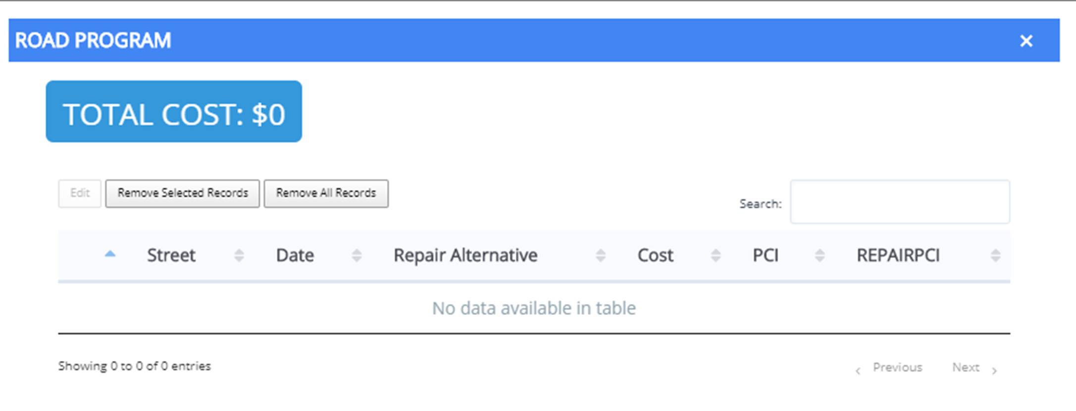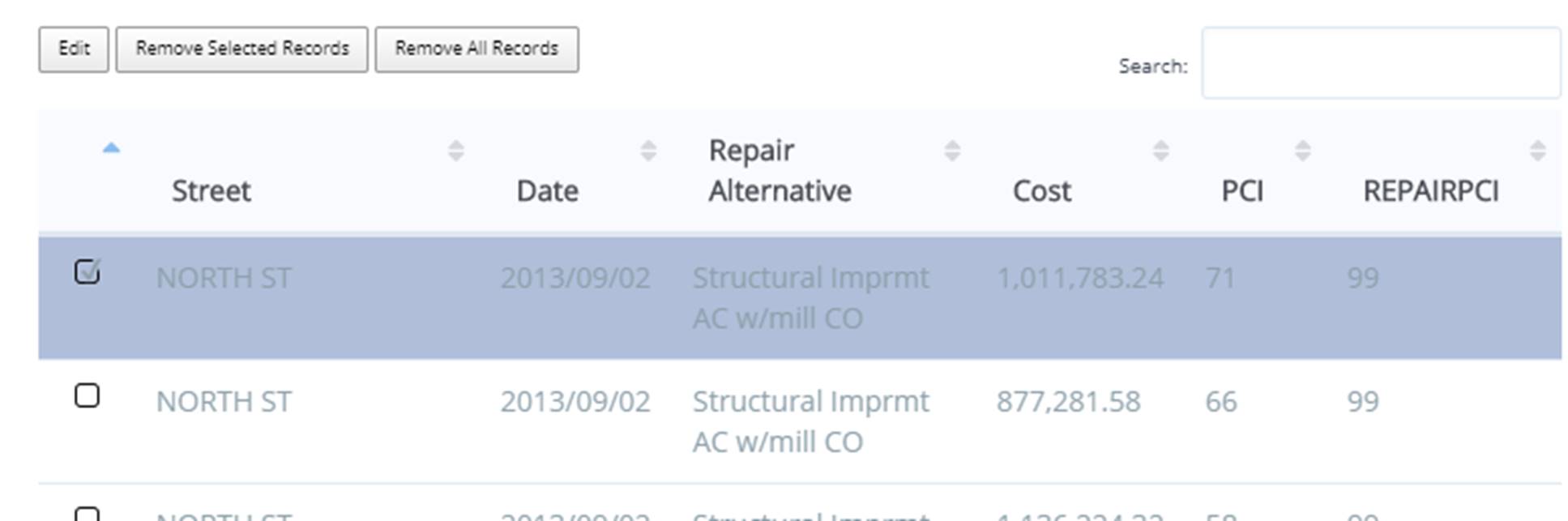 To remove one or more treatments/repairs in the Road Program, select the record/s in the list and choose Remove Selected Records.
