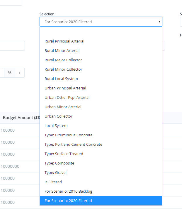 The Selection drop down menu will contain all global selections in the SAM IS Pavement configuration. Additionally, any previously-established selection criteria for scenarios will be listed.