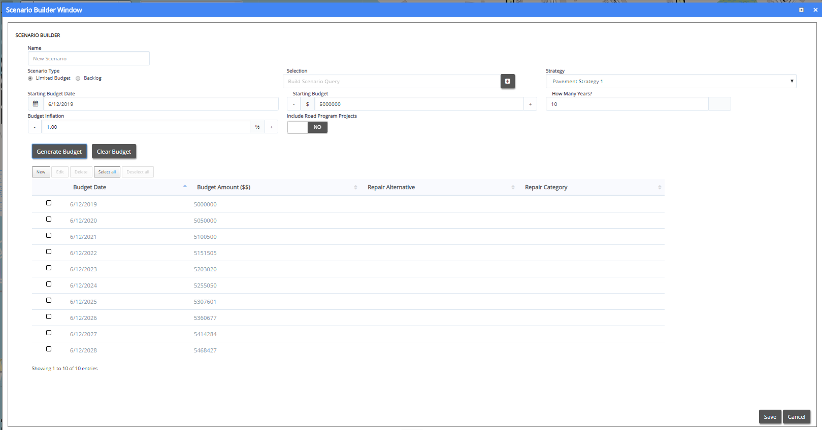 In a limited budget scenario, SAM IS Pavement analyzes the impact of a user-defined funding limit on the pavement network over a specified number of years. Choose a treatment/repair strategy and then a starting date. You quickly define a budget by using the starting budget amount and number of years; then click Generate Budget. You can optionally set an inflation rate to be factored in to subsequent years.