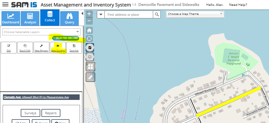 To record a survey for a road segment, select a single segment feature and choose New Surveys on the Collect capability panel.