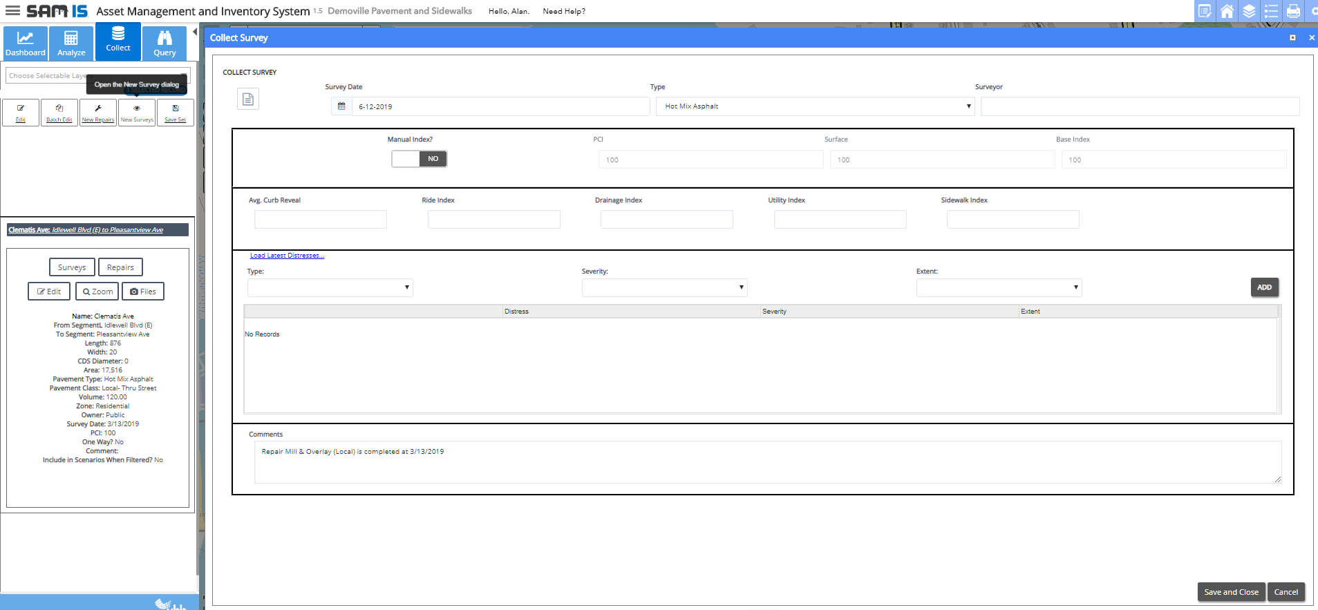 To load in the last reported distresses for the road segment, choose Load Latest Distresses.