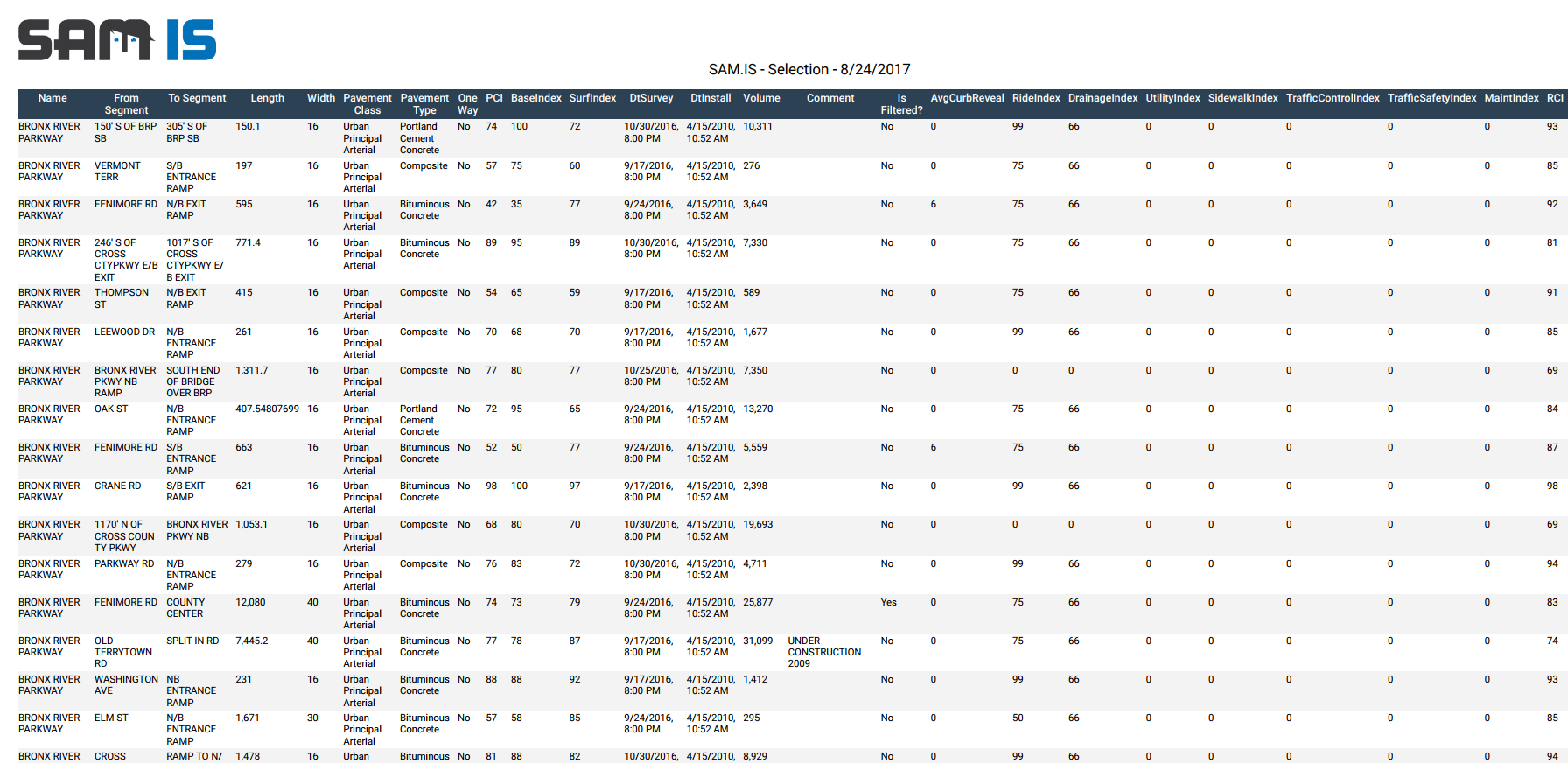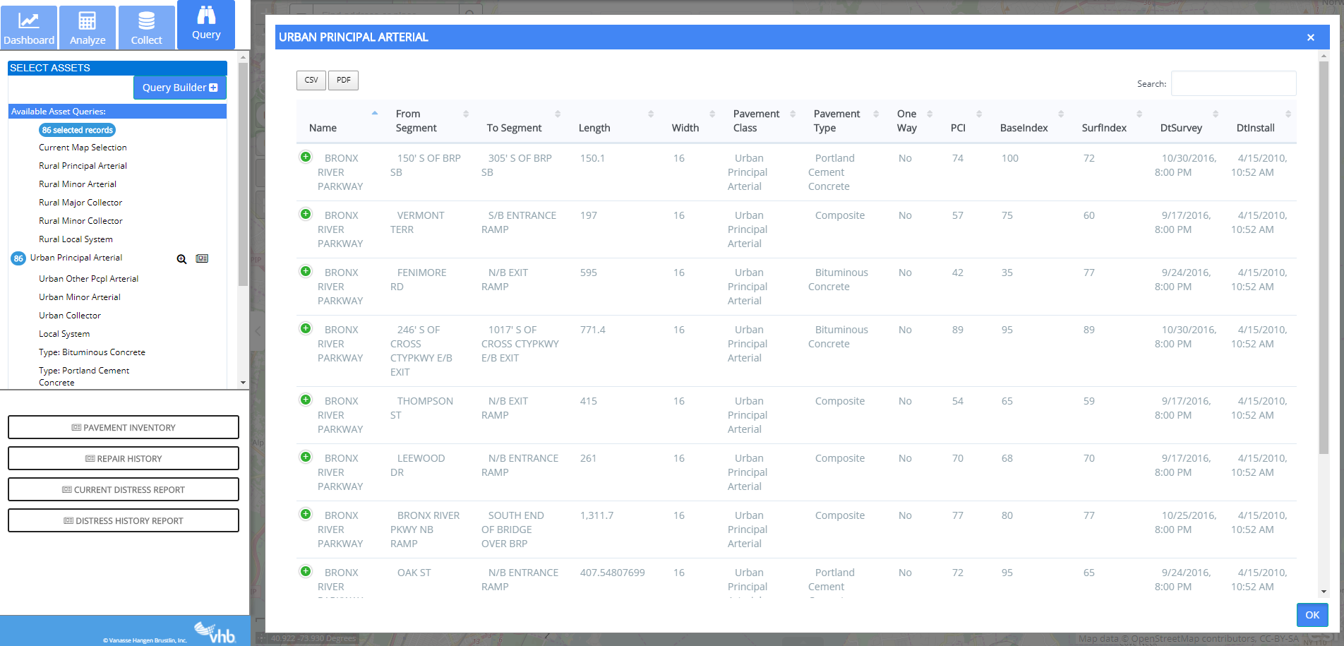 Results can be sorted by column name, and can be exported to .csv or .pdf formats.