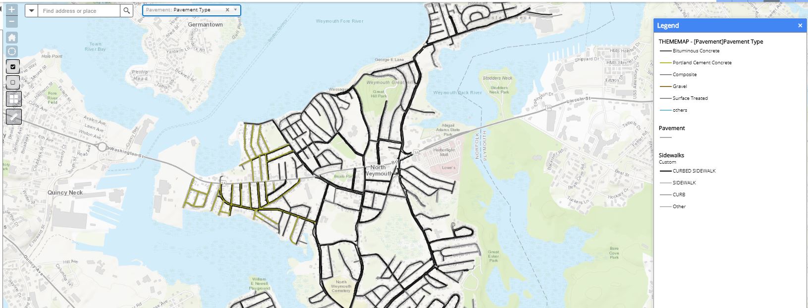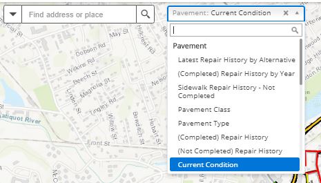 The Map Themes drop-down menu bar on the map controls the display of previously-defined thematic maps, representing the characteristics of your assets.