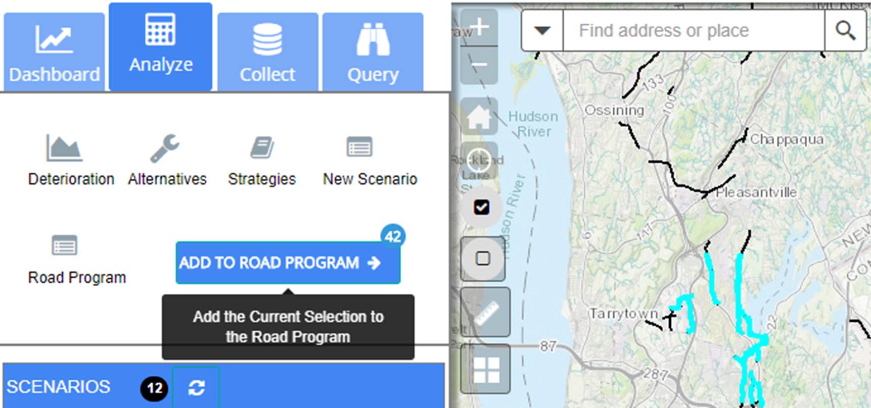 To designate pavement segments to be included in the Road Program, first make a map or query selection. Then select the Analyze capability panel, and then click Add to Road Program.
