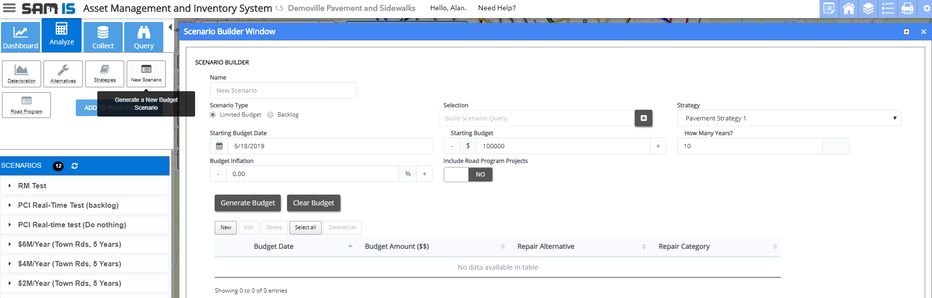 Name your new scenario. Next, choose a scenario type: limited budget or backlog.