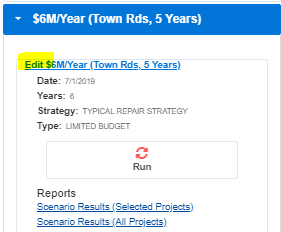 To modify an existing budget scenario’s criteria, choose the Edit… option from the details area of the chosen scenario. Adjust the scenario criteria and choose Save.