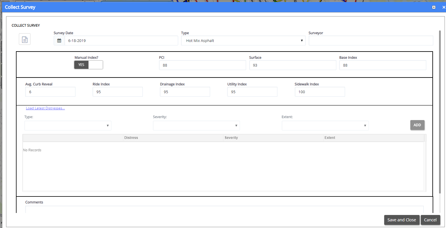 To load in the last reported distresses for the road segment, choose Load Latest Distresses.