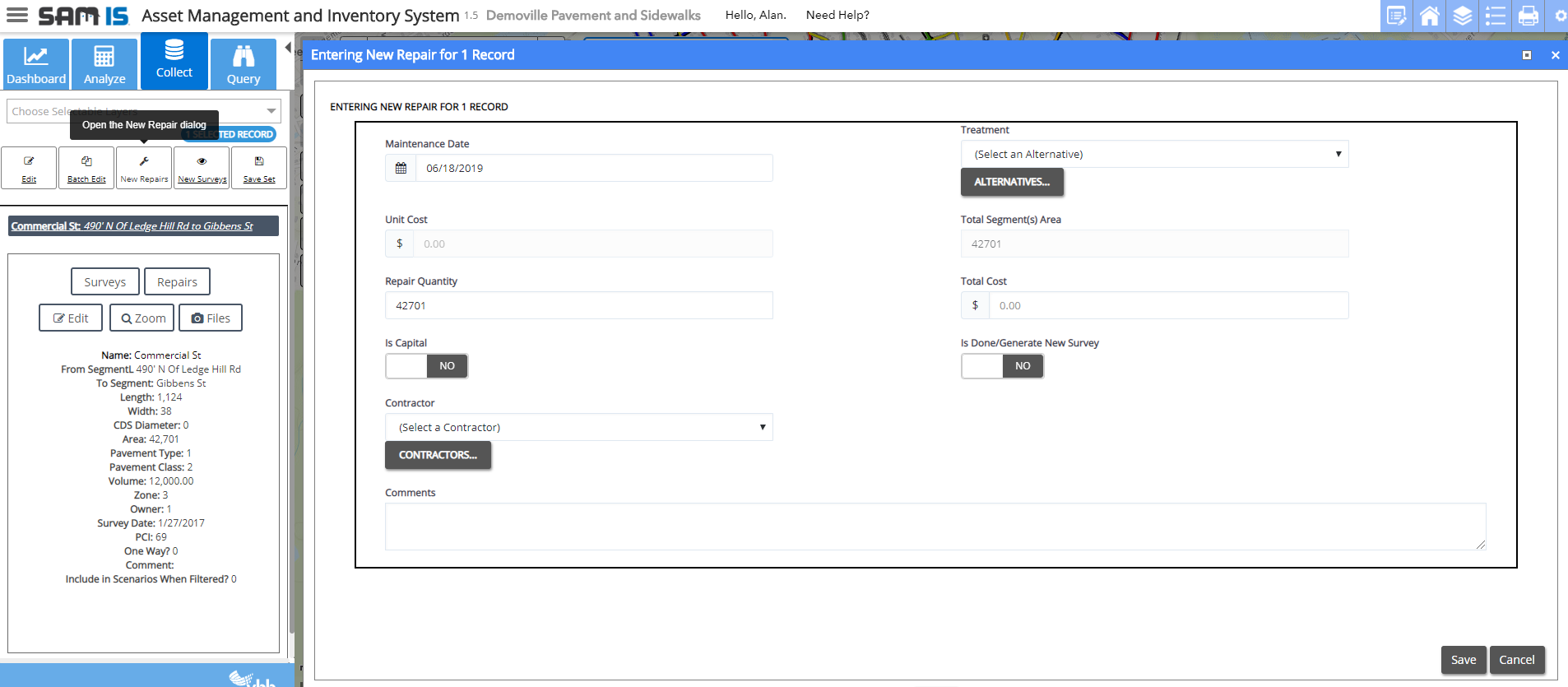 To enter a treatment/repair record for one or more road segments, choose New Repair from the Collect capability panel.