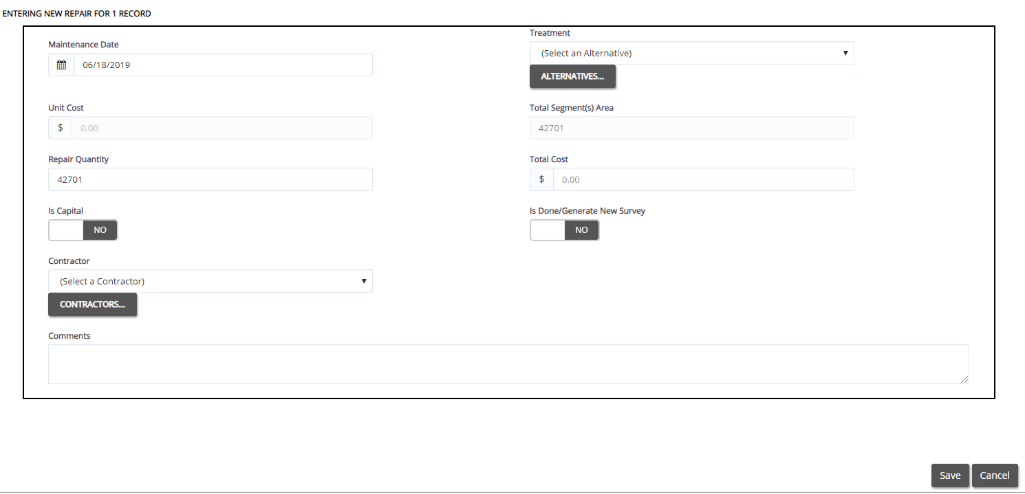 If the treatment/repair was not performed on the entire segment, or if you would like to explicitly track the area treated/repaired, you may enter in the treatment/repair quantity directly, and the corresponding total cost will be calculated.