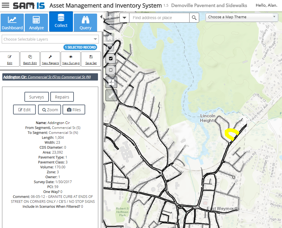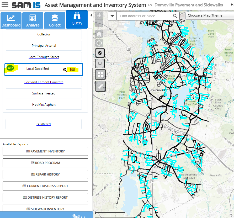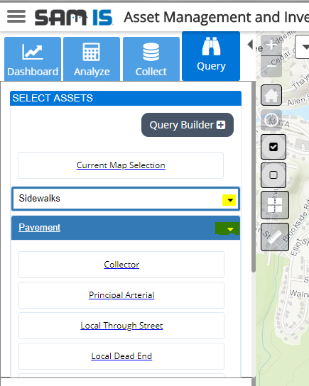 On the Query capability panel select a query from the Available Asset Queries list to select features matching the query’s criteria. You may need to click the drop-down arrow to select a query from a specific asset type.