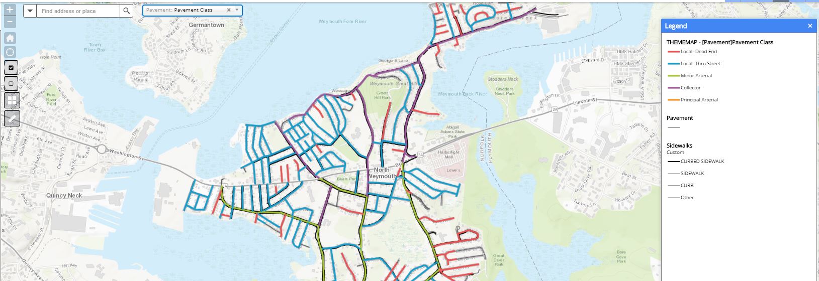 The Map Themes drop-down menu bar on the map controls the display of previously-defined thematic maps, representing the characteristics of your assets.