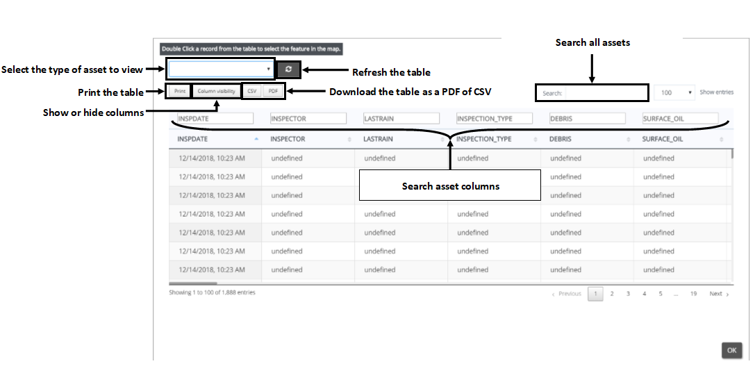 •Select the type of asset to view: Select the type of asset to view in the attribute table if multiple types of assets are selected (e.g., Outlets)
